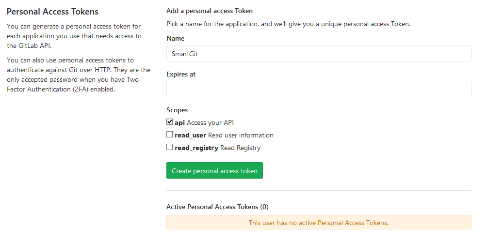 If you do not already have a Personal Access Token for SmartGit, you can create this token in your GitLab account Settings, section Access Tokens. Be sure to have at least api scope enabled.