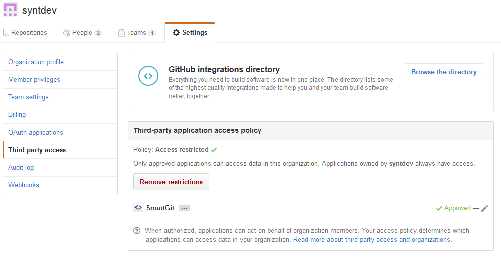 If you are authenticating using OAuth and you can’t see private repositories of your GitHub organization or pushing to your organization’s repositories fails with HTTP error code 403, make sure that your organization allows Third-party access and SmartGit is Approved. Your organization settings might look like this: