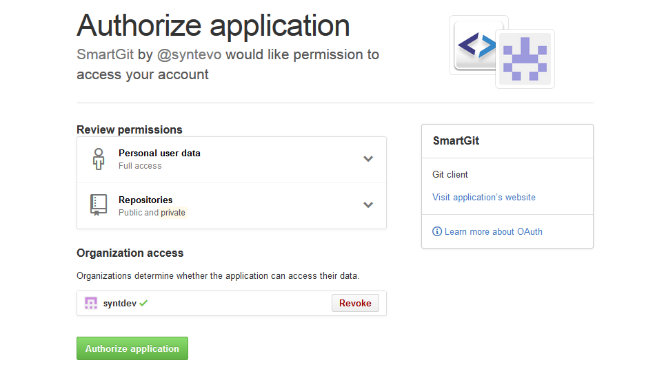 Once you have authorized SmartGit, it will show up in your GitHub Settings, section Authorized Applications. If you need to rerun through the Authorization process outlined above, you have to Revoke access there first and start over.