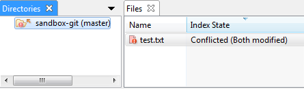 A merge, rebase or cherry-pick may fail due to conflicting changes between two or more commits. If that happens, SmartGit will halt the operation and remain in a conflict state. The following screenshot shows what the Repositories view and Files view would look like in that state: