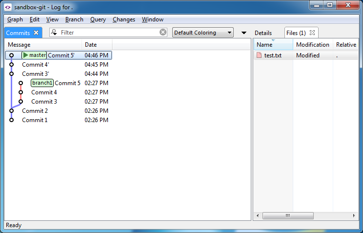 - Finally, remove branch1 to discard the old history. There are two ways to do this: (1) Select Branch|Branch Manager from the main menu, then select branch1 on the dialog, then click on the Delete button. (2) Open the Log window (Query|Log), select the commit to which branch1 is attached, select Delete from the commit’s context menu, then follow the dialog instructions.