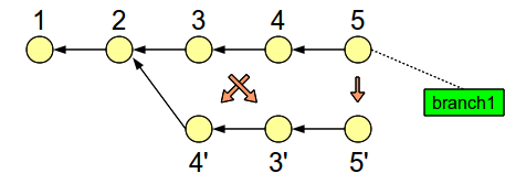 In Git, if you move a branch pointer elsewhere, you risk losing the commits the branch pointer was pointing at, since the commits might become unreachable. To prevent this, we’ll have to create an additional branch pointer, in this case named branch1, which points at commit 5.
