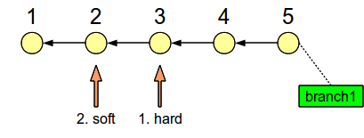 Now here’s the trick: After creating branch1 (without switching to it), we’ll do a hard reset on commit 3, then a soft reset on commit 2. This is shown below: