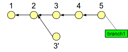 In this state we can now alter the contents of the Index and/or working tree in order to prepare a modified version of the original commit 3. Then, when we commit these changes, the history will branch off from commit 2 (since that’s where our branch pointer was) to a new, modified commit 3’: