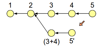 So far, we’ve seen how to modify an older commit. A more general problem is modifying an entire range of older commits. For example, how can we merge the changes from commit 3 and 4 into a single commit? This is shown below: